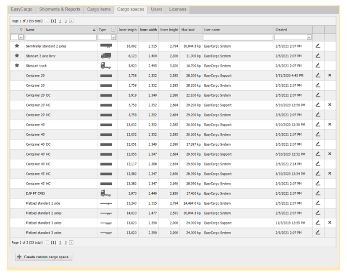 I vår katalog finns det många olika containrar, pallar och lastbilar tillgängliga. De som är fördefinierade i appen hittar du i Lastutrymmen-fliken.